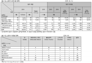 한국수입자동차협회(KAIDA)는 2019년 9월 수입 상용차 신규등록대수가 304대로 집계됐다고 발표했다. 9월 상용차 브랜드별 등록대수는 볼보트럭(Volvo Trucks)137대, 스카니아(Scania) 59대, 만(MAN) 56대, 메르세데스-벤츠(Mercedes-Benz) 43대, 이베코(Iveco) 9대이다.